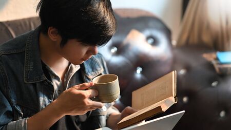 Closeup man reading a book and holding a coffee cup in hands while sitting at the leather couch over comfortable living room as background. A man got relaxing while quarantine himself at home.