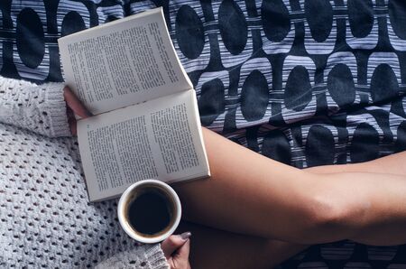 Detail of sexy young woman. Woman keep a coffee cup and read a book. She is sitting on a blanket.. Naked legs. Home atmosphere.