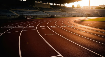 Athletic stadium running track at sunrise with stadium seating and lane markings visible