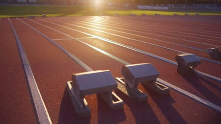 This captivating image captures starting blocks on a running track, illuminated by warm sunset light, perfect for themes of athletics, performance, and motivation.