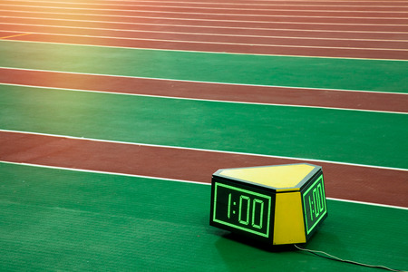 Running track with marking lines. Horizontal shot with shallow depth of field