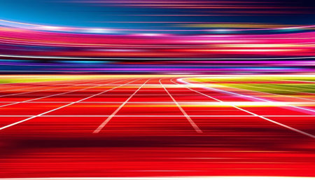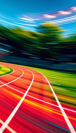 Dynamic Perspective of a Running Track at Sunrise, Capturing Sprinters in Action on Red Lanes