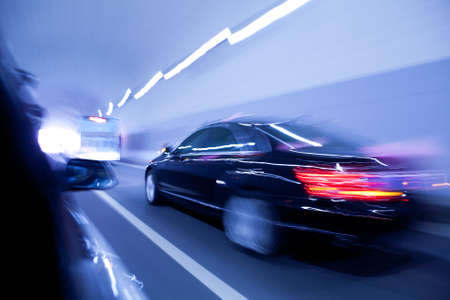 A cinematic view of a car speeding through a tunnel at night, with the tunnel lights creating a streaking effect, emphasizing motion, power