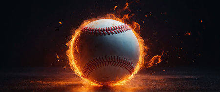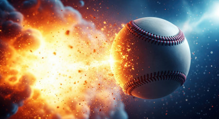 A vivid image of a baseball set against a backdrop of fiery explosion. The baseball is prominently featured in the center, with intense flames and sparks radiating around it. The contrast between the calm, white baseball and the chaotic, fiery background creates a dramatic effect.