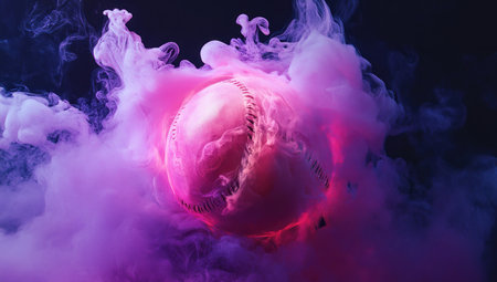 A baseball with smoke emanating from it, featuring a pink and purple color scheme against a black background, in the style of product photography. --ar 53:30 --v 6.1 Job ID: cb72d11a-e47b-4512-900b-a1c074ddfec3