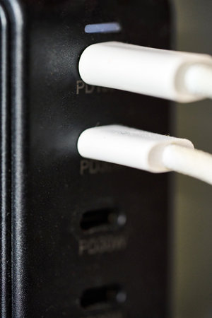 Cables are plugged into a device located on a flat surface. The device has ports for charging electronics.