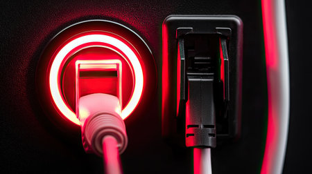 This close-up image captures a modern power socket with an illuminated USB port and a charging cable, showcasing technology and functionality in everyday life.