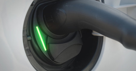 A closeup shot of an electric car being charged with an illuminated green light
