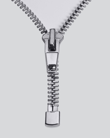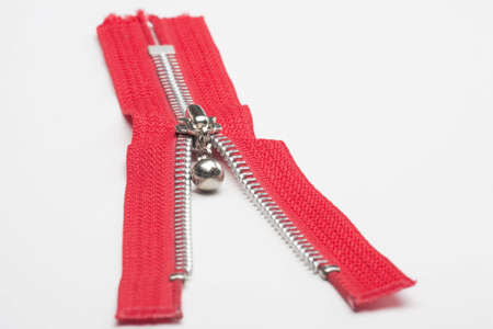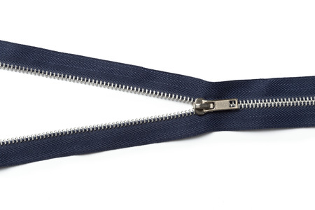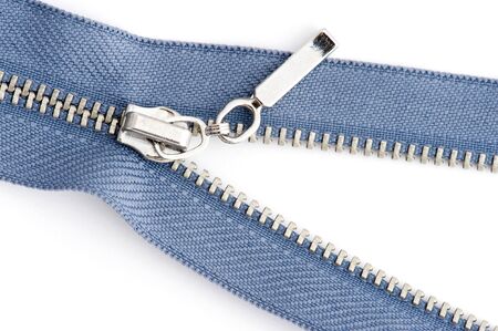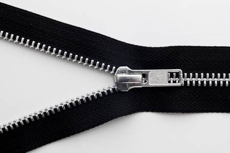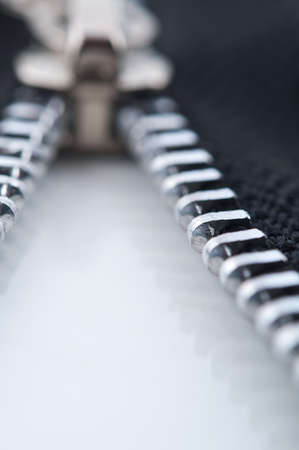 Zipper on a white background. Black zipper on white background, closeup of photo with selective focus. Close-up of zipper.Macro photo.