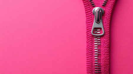 A close up view of a bright pink zipper on a contrasting background showcasing its design and textures in vivid detail.