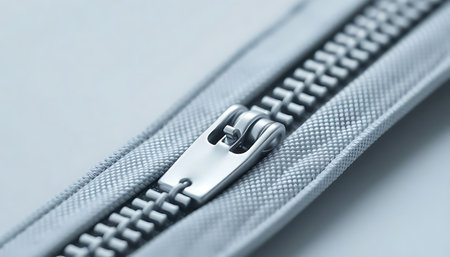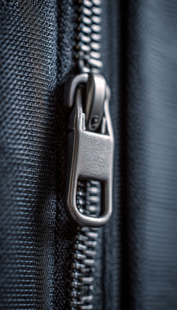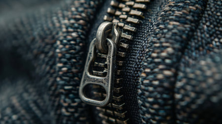 Macro shot of a metal zipper on denim fabric highlighting the texture and details