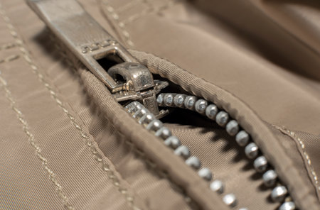 Close-up zip lock on light-colored clothing, jacket. Zipper closure with lock.