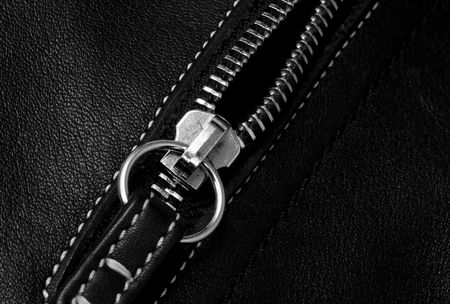 metal zipper on a black leather product, zipper on a black women's handbag close-up
