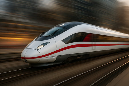 A sleek high-speed train races through an urban environment, showcasing the synergy between modern technology and vibrant city life, emphasizing speed and efficiency.