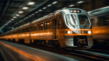 High speed bullet train speeding through a dark tunnel, creating dynamic motion blur and vibrant light trails. represents modern transportation, speed, and technological progress.