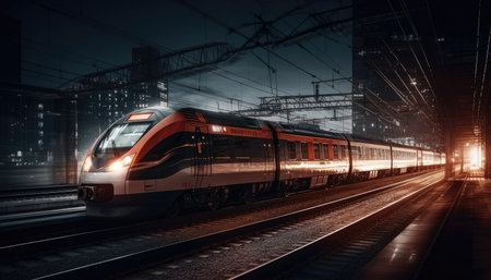 A high-speed train glides through an illuminated urban area at night, capturing the essence of modern transportation amidst a vibrant city skyline and dynamic energy.