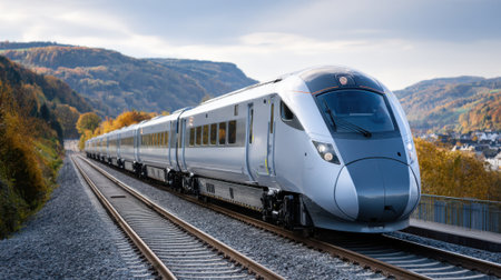 A sleek high-speed train races through a colorful countryside, surrounded by rolling hills and trees in autumn hues under a gentle sky. The scene captures the harmony of nature and technology.