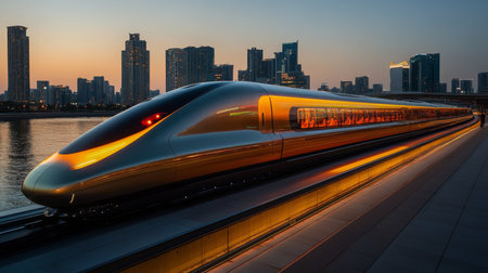 Modern High Speed Train Gliding Alongside a City Skyline During Twilight With Reflections in Water Generative AI