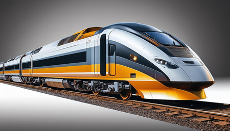 A sleek high-speed train zooming along a modern railway track, with its streamlined design and motion blur capturing the essence of speed against a clear sky.