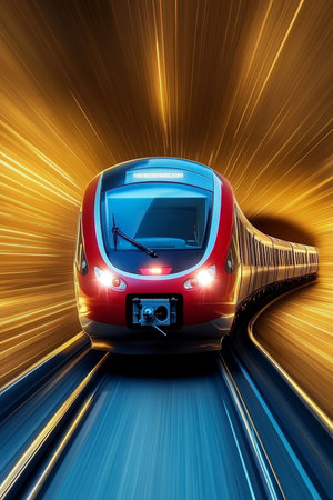 A high-speed train traveling through a modern urban tunnel system, showcasing the integration of rail infrastructure with city planning.