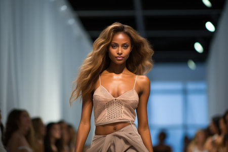 Beautiful women walks runway show strut down the catwalk wearing nude fashion creations, authenticity and inclusivity concept