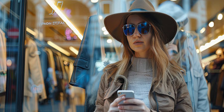 Young woman in hat and sunglasses using smartphone in shopping mall. Shopping concept