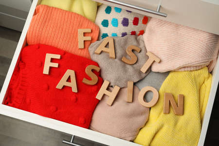 Phrase FAST FASHION made of wooden letters and different clothes in open drawer, top view