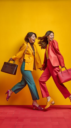 two girlfriends standing side by side posing fashion luxury