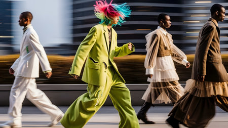 Models walk down a fashion runway wearing trendy suits and colorful hairstyles, captured with a motion blur effect. The dynamic image conveys the fast-paced energy and artistic style of the fashion industry.