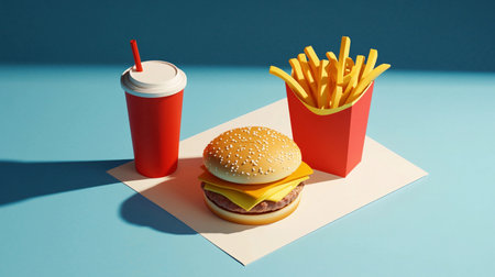 A hamburger, french fries and a drink are shown, AI