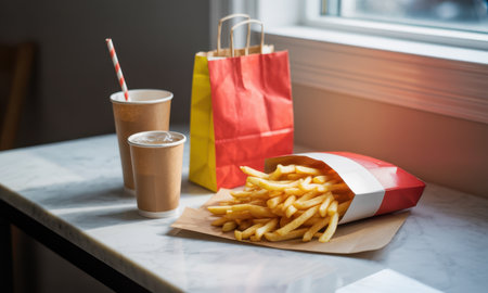Crispy golden french fries in a paper container with two cold beverages in disposable cups and a colorful take out bag on a white marble table by a window, representing quick service and convenience.