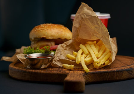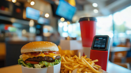 Juicy cheeseburger with fries and drink served in a fast food restaurant
