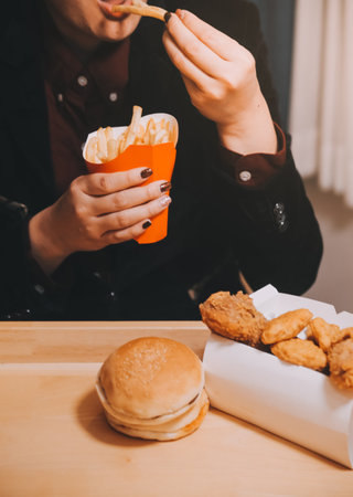 Overweight problem, poor diet, calorie-laden food, fast food cheeseburger burger, fat woman, obese persona, high calorie quick food, motivation to eat rich, fatty foods, dieting, new life