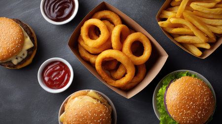 A vibrant assortment of fast food featuring juicy burgers, golden fries, and crispy onion rings, perfect for a quick meal or gathering with friends.