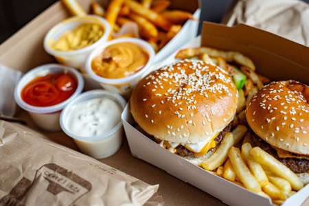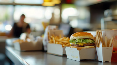 AI Generated. Delicious cheeseburgers and fries display in a fast food restaurant