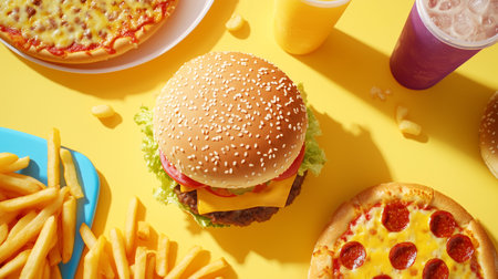 Assorted fast food spread featuring a large burger, fries, and pizzas on a bright yellow table