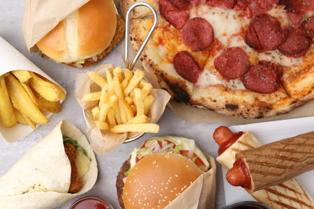 Different delicious fast food on light gray textured table, flat lay