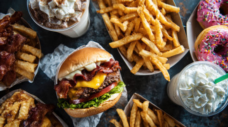 A vibrant fast food meal featuring a juicy hamburger with cheese, crispy French fries, and colorful milkshakes with sprinkles, ideal for visual appeal.