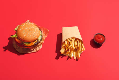 Burger and Chips. Hamburger and french fries in red paper box. Fast food on red background. Hamburger with tomato sauce. Top view, flat lay with copyspace
