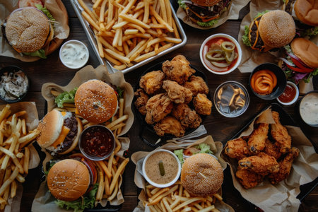 Generative AI illustration of delicious typical American food with hamburgers, hot dogs, chicken, french fries, sauces, corn, soft drinks, vegetables