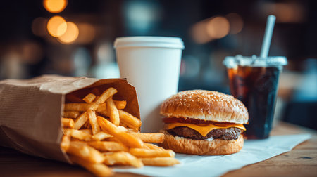 A tempting cheeseburger paired with crispy fries and a refreshing soft drink, presented in a cozy cafe setting that invites a casual dining experience.