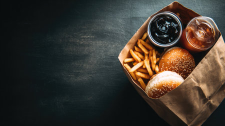 A mouthwatering takeout meal featuring freshly made burgers, crispy fries, and refreshing soft drinks in a cozy brown paper bag on a dark surface.