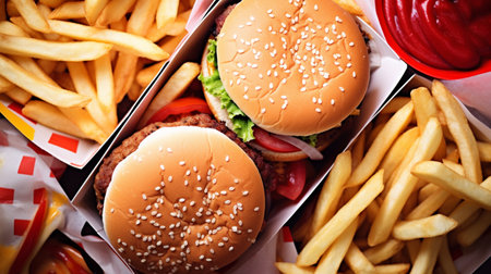 Delicious fast food feast with burger and fries.