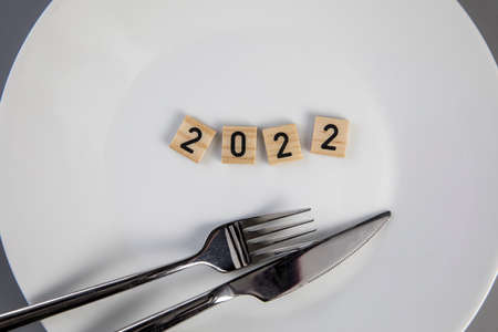 Fork and knife on a white empty plate with 2022 text top view, New year diet, healthy eating concept background