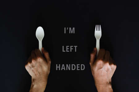 Left handed person holding the spoon on left side with black background for International left handers day concept