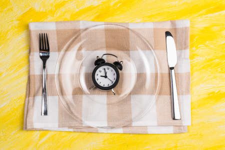 concept of intermittent fasting, ketogenic diet, weight loss. alarm clock fork and knife on a plate