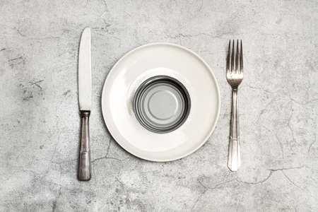 Can of preserves on a plate with cutlery and on a marble background in a top view
