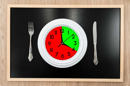 Clock with one portion marked in red and another in green. Concept of intermittent fasting, a diet that provides benefits such as the regenerative mechanism of autophagy.
