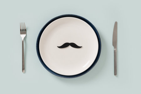 Creative table setting for Father Day. Dining white plate decorated moustache on color blue background. View from above. Copy space