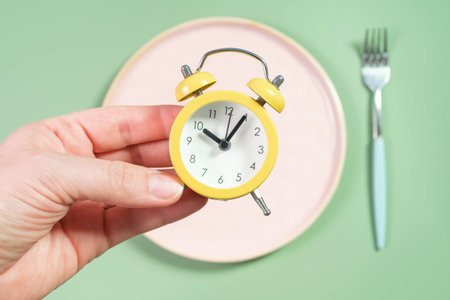 concept of intermittent fasting, ketogenic diet, weight loss. alarmclock on plate